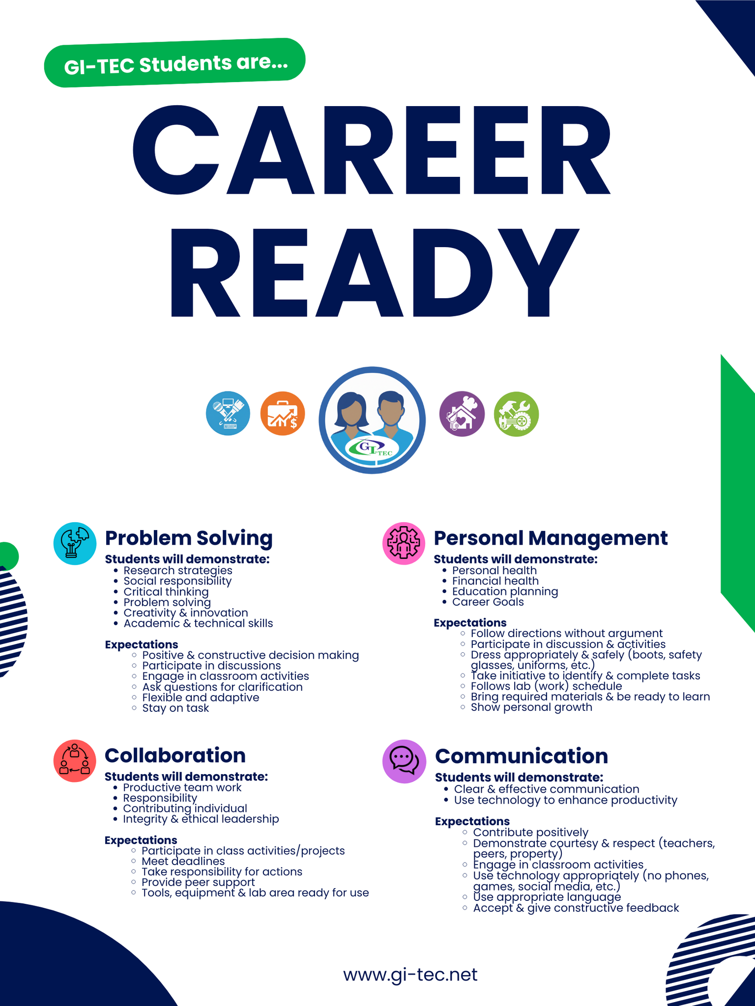 The Gratiot Isabella Technical Education Center (GI-TEC) integrates Career Ready into the grading of its Career and Technical Education (CTE) programs because it measures the essential, foundational skills—Problem Solving, Collaboration, Personal Management and Communication—that are necessary for success in any technical career field. By including Career Ready proficiency as a significant component of the final grade, GI-TEC incentivizes students to prioritize and master these workplace competencies. This grading approach ensures that students leave the program not only with technical skills but also with qualifications that demonstrates they meet industry-recognized standards for overall career readiness.
